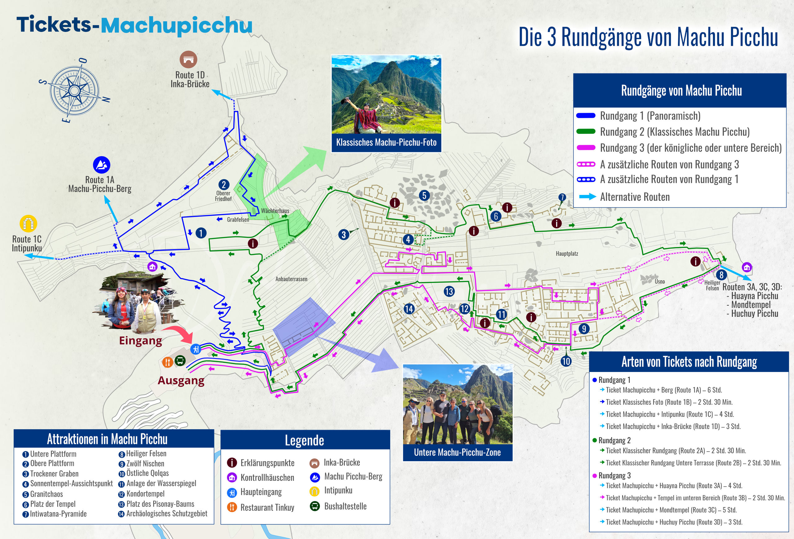 Die beliebtesten Tickets für Machu Picchu beinhalten einen der drei offiziellen Rundgänge durch die Inka-Stadt. Das Ticket „Machu Picchu Klassisches Foto oder Obere Terrasse (Route 1B)“ ermöglicht den Rundgang durch Circuito 1, ideal für diejenigen, die das klassische Postkartenfoto machen möchten. Das Ticket „Machu Picchu Klassischer Circuit Design (Route 2A)“ bietet den umfassendsten Besuch der wichtigsten Bauwerke von Machu Picchu. Das Ticket „Machu Picchu Untere Tempel oder Design der Könige (Route 3B)“ beinhaltet den Rundgang durch Circuito 3, der sich auf die untere Zone der Zitadelle mit ikonischen Tempeln konzentriert. Zudem bietet Machu Picchu Wanderungen zu den umliegenden Bergen der Zitadelle an, wobei die am meisten nachgefragte Route der Aufstieg zum Huayna Picchu ist, der auch den Eintritt zu Machu Picchu über Circuito 3 umfasst.